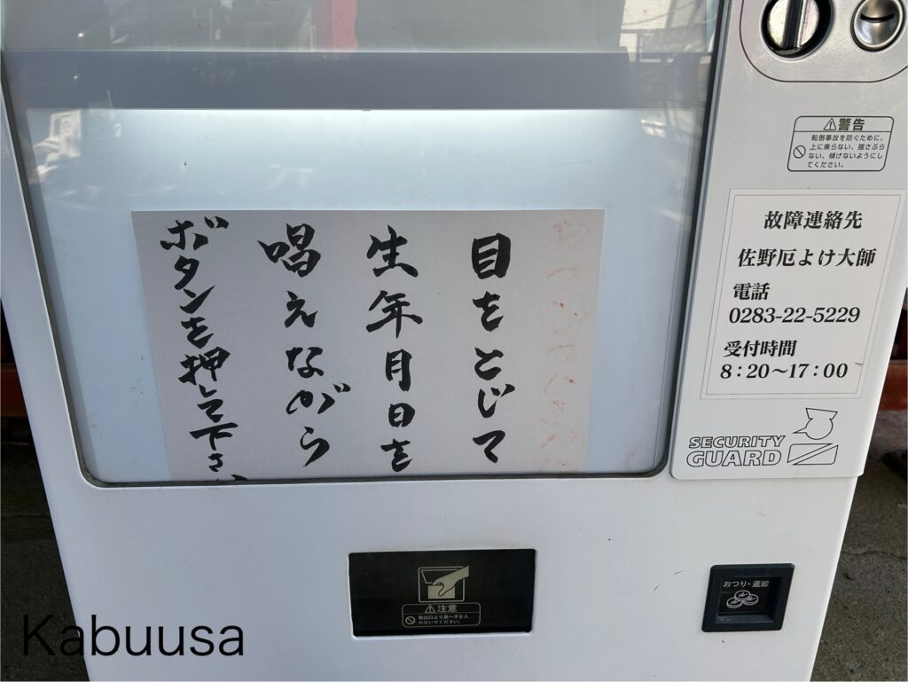 “目をとじて生年月日を唱えながらボタンを押して下さい。” と書いてある通り、自動販売機に300円を投入後、目をとじて生年月日を唱えながら自動販売機のボタンを押しました。
