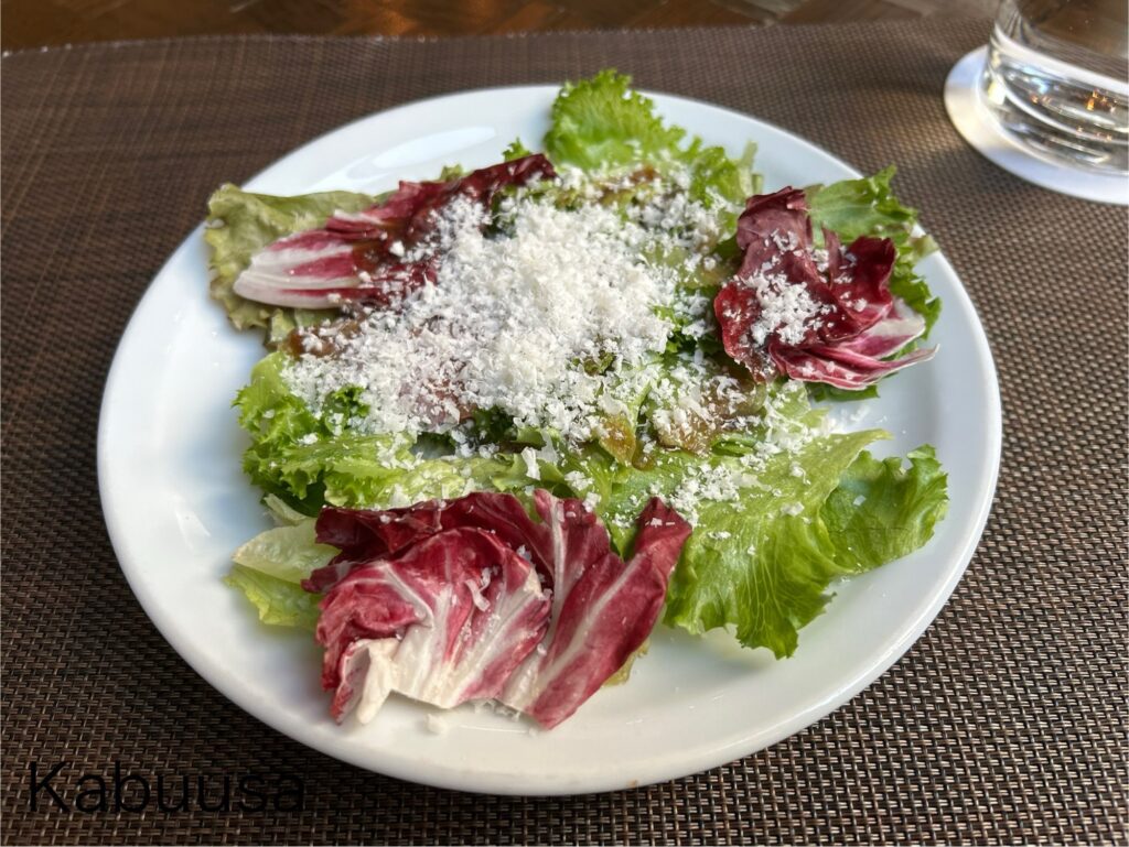 レタスと玉ねぎのスライス、そしてチーズがたっぷりとかかったサラダで、ドレッシングは、たぶんバルサミコ酢で甘めです。