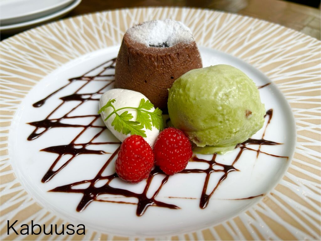 フォンダンショコラは、ナイフを入れると中からとろ~っとチョコレートが溢れ出し、これぞ!フォンダンショコラ!!って感じのでした!ピスタチオアイスは、中につぶつぶのピスタチオ?が入っていて濃厚で美味しかったです。