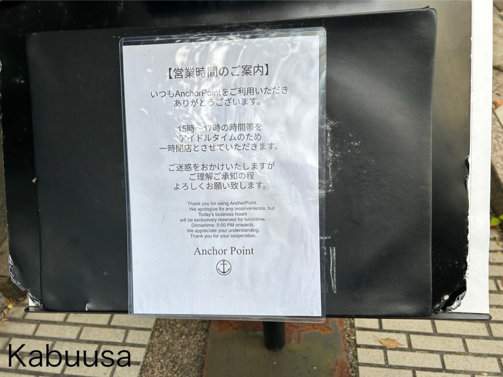 Anchor Pointでは、15時〜17時のアイドルタイムを設けているとのことで、ランチの営業は14:30ラストオーダーの15:00閉店となっているので、行く際はお気をつけあれ。