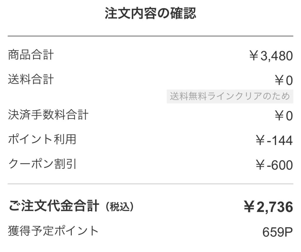 2注文目も、お買い物合計3,000円(税抜)以上の購入で使える【株主優待】割引 600円クーポンを利用して購入。