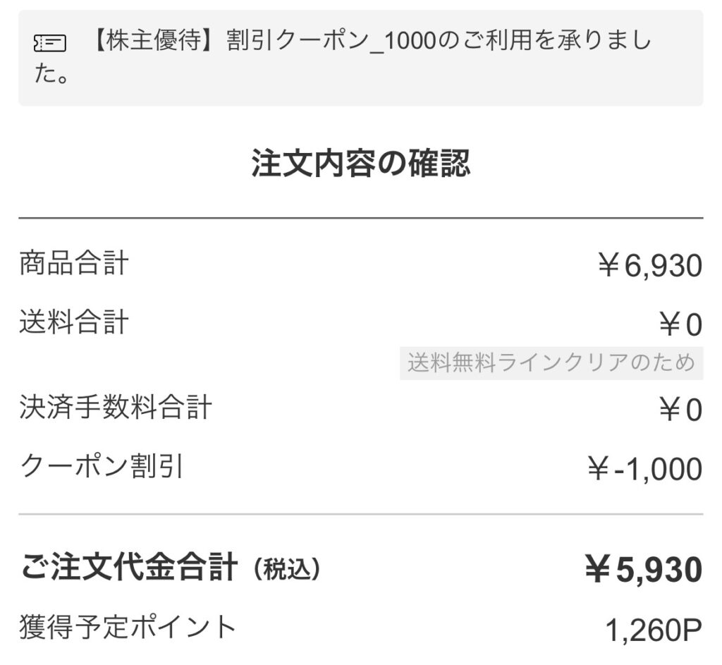 3注文目は、お買い物合計5,000円以上(税抜)以上の購入で使える【株主優待】割引 1,000円クーポンを利用して購入。