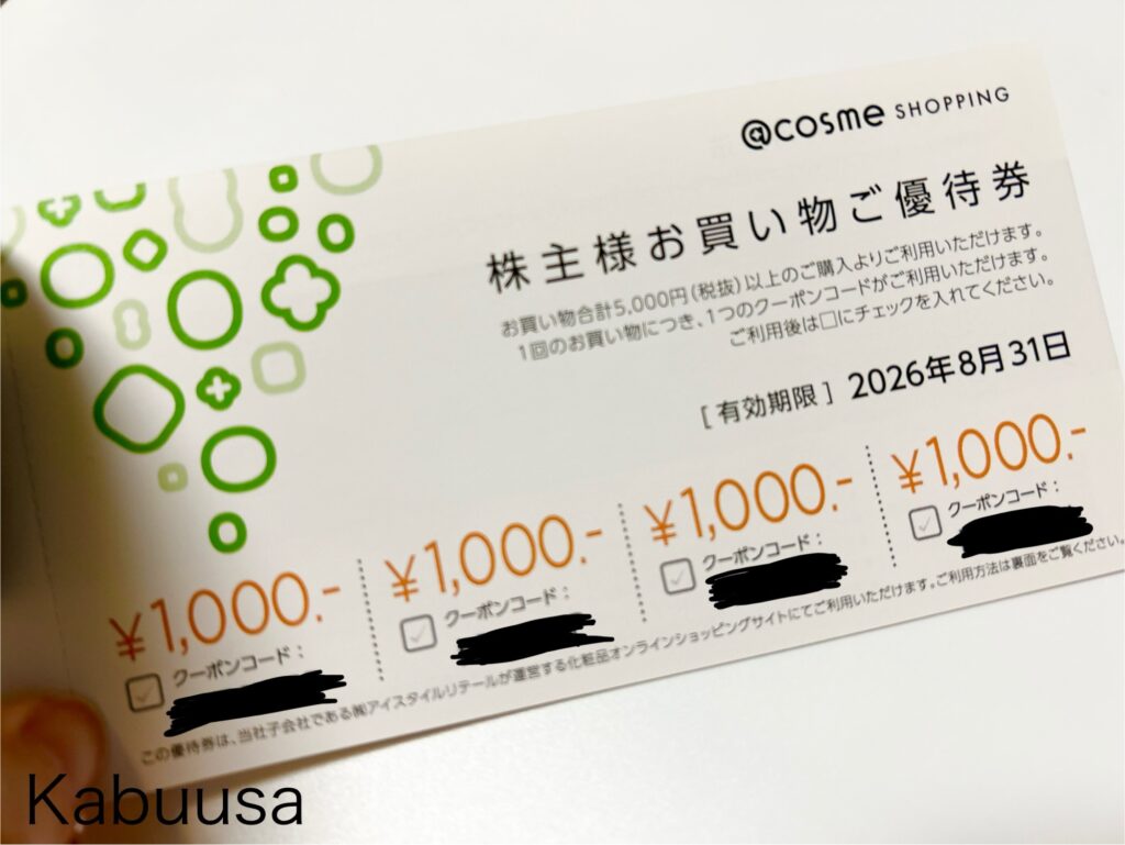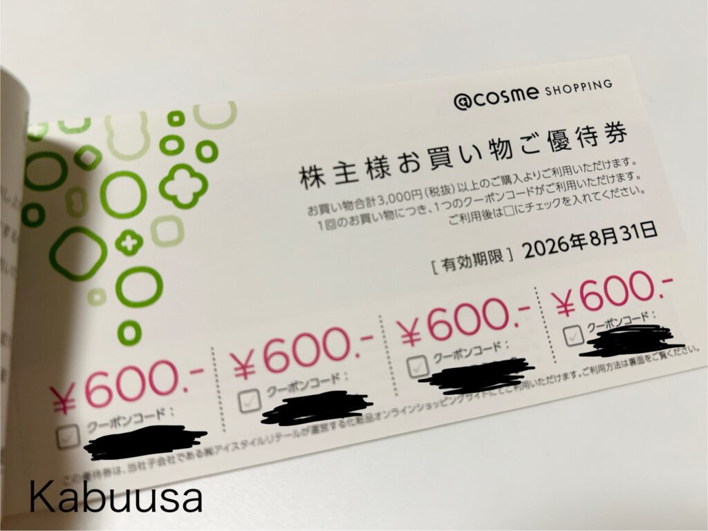 ①化粧品オンラインショッピングサイト「@cosme SHOPPING」で使える株主様お買い物ご優待券