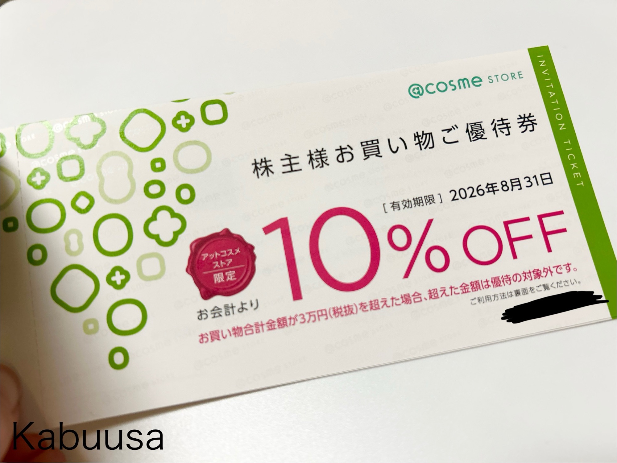 ②リアル店舗「@cosme STORE」で利用できる株主様お買い物ご優待券 10%OFF(お買い物合計金額3万円(税抜)まで適応)
