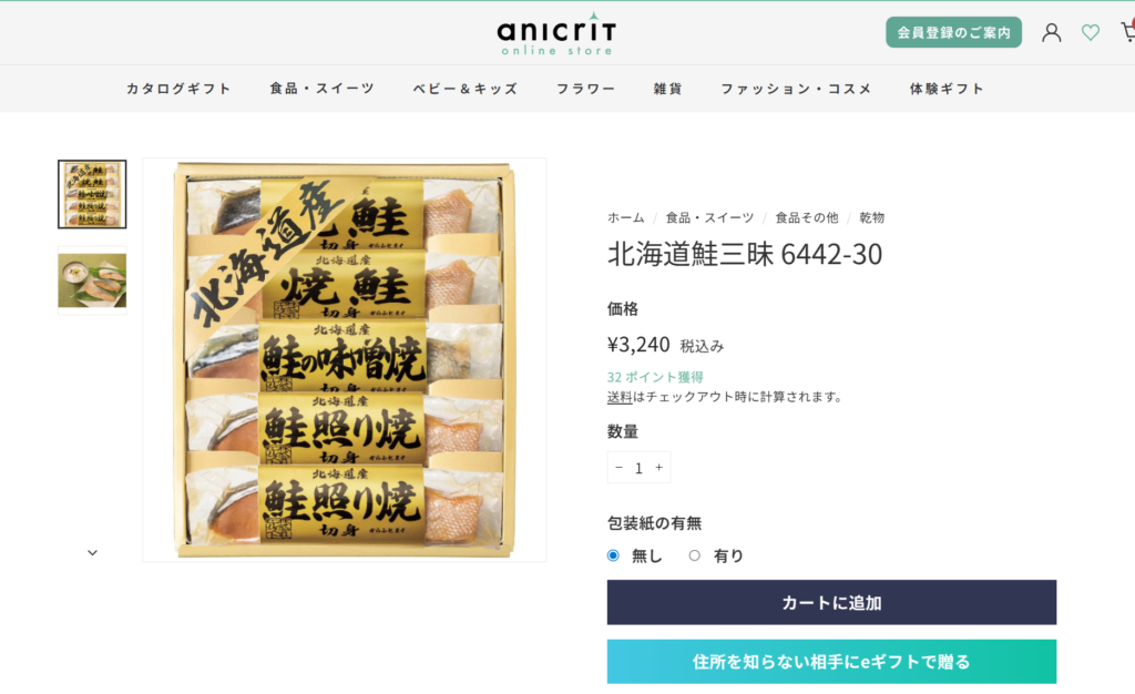 アニクリオンラインストアの商品の中から、今回は「北海道鮭三昧 3,240円」を選択しました。