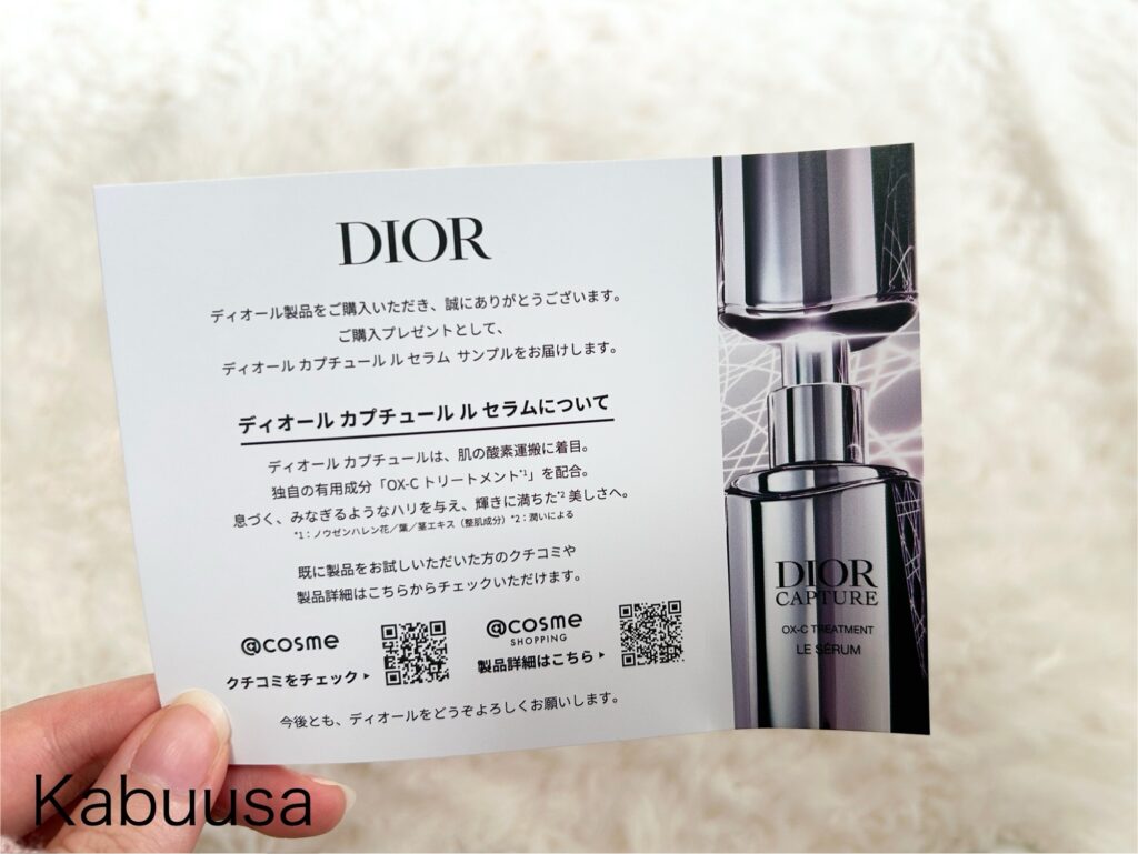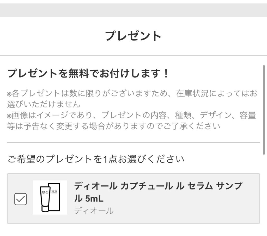 ディオール バックステージ グロウ マキシマイザー パレットを@cosme SHOPPINGで購入した時、下記のプレゼントが表示され、「ディオール カプチュール セラム サンプル 5mL」を無料でお付けします。に☑を入れたので、サンプルも同梱されていました。