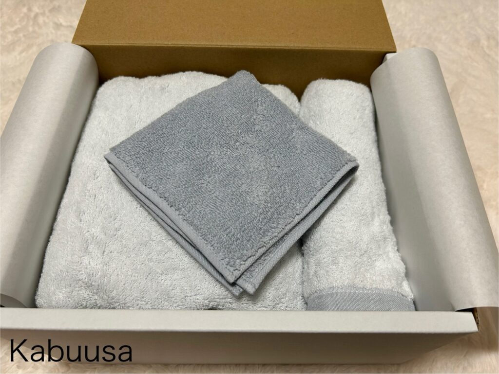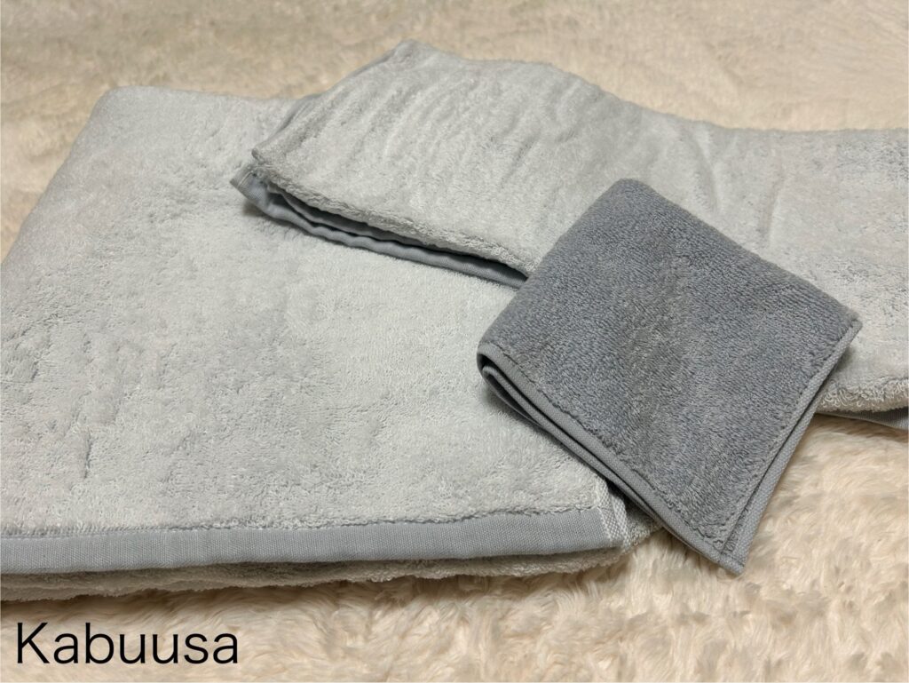 青みがかったほんのりブルーみを感じるグレーのハンドタオル、フェイスタオル、バスタオルの3点セットです。綺麗な色で、家のインテリアにも邪魔することなく、馴染みます。