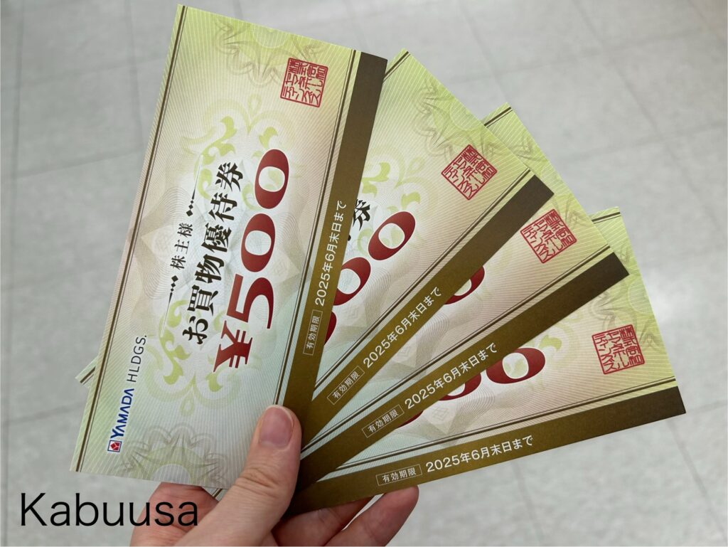 ヤマダホールディングス(9831)の株主優待のお買物優待券は、1回のお会計1,000円ごとに1枚(500円分)を使うことができ、”実質半額”になる優待です。
