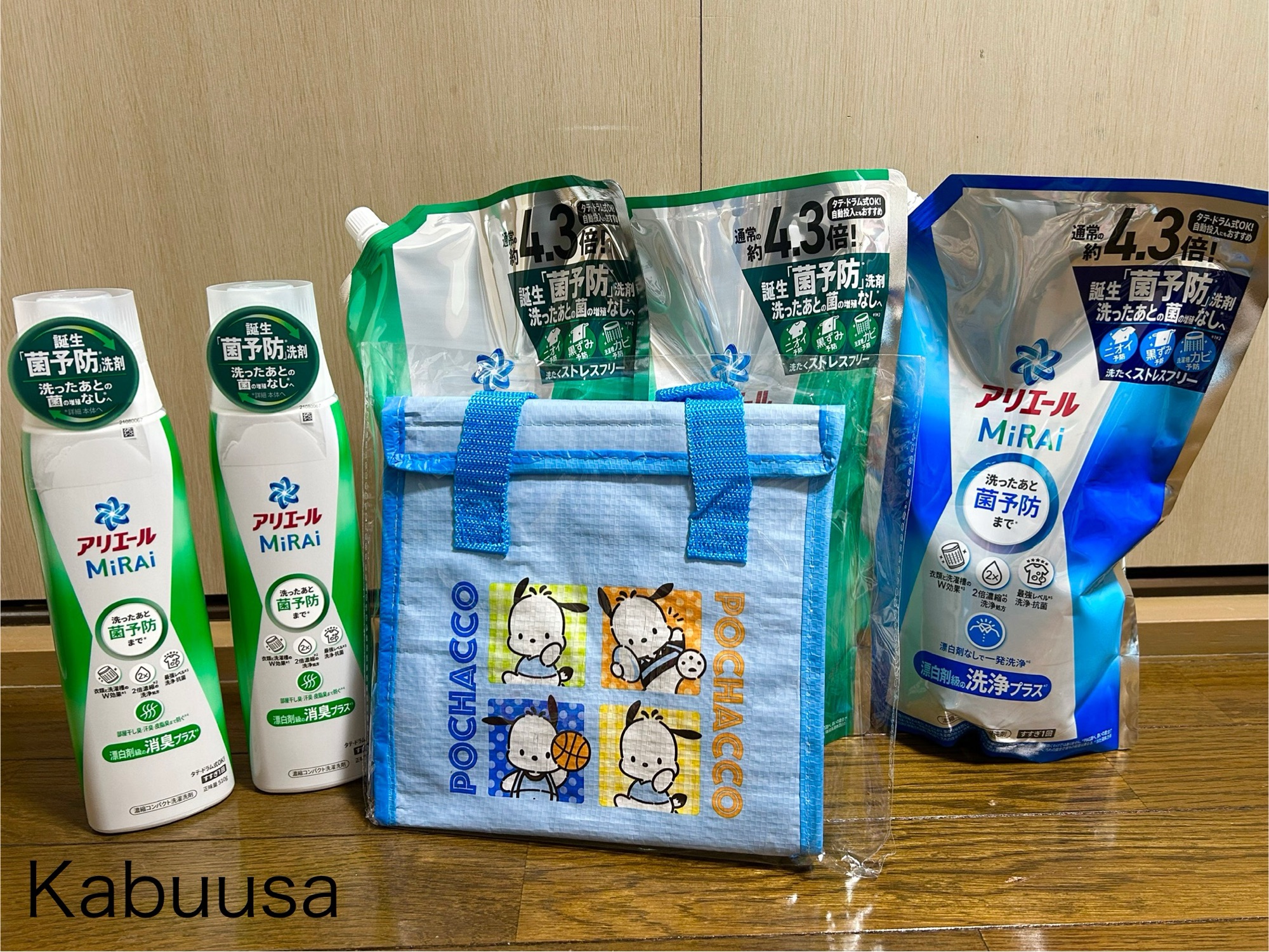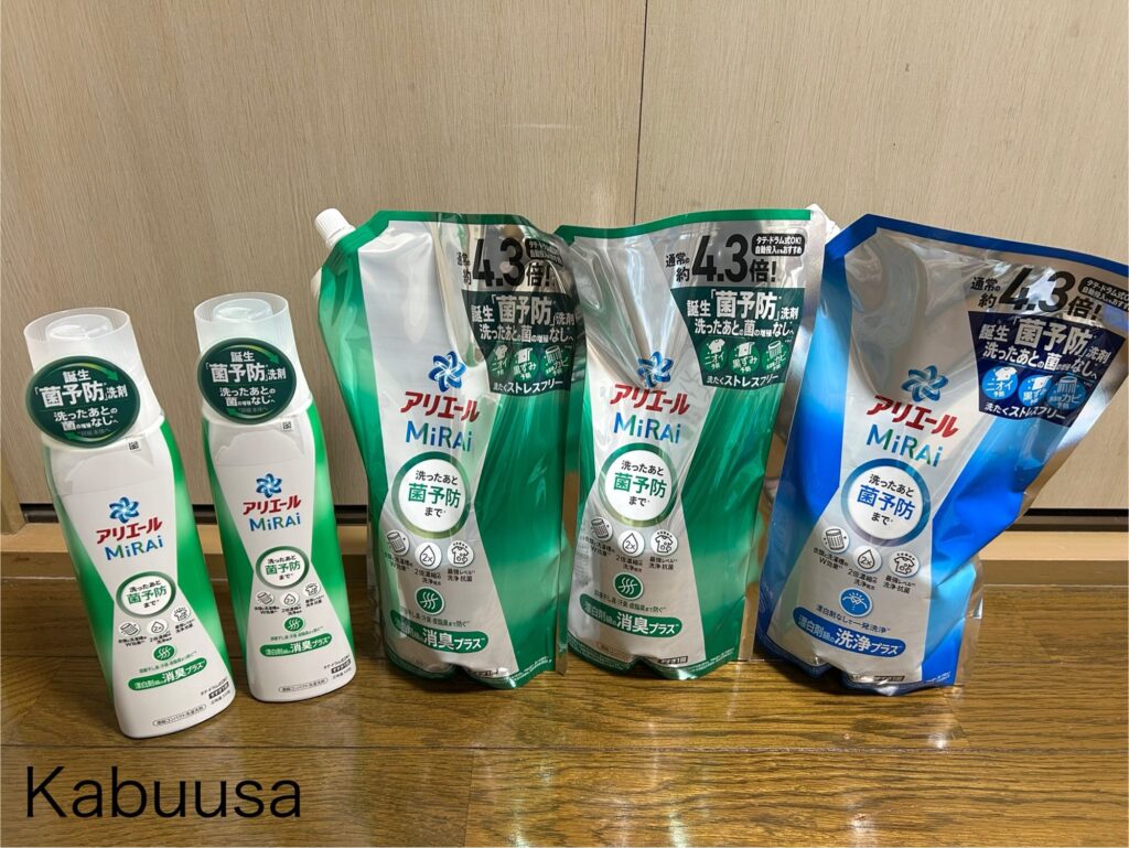 店舗によっては、食品や化粧品などを置いている店舗もありますが、今回、かぶうさが行った店舗には置いてなかったので、洗濯機コーナーの横にあったこちらの洗濯用洗剤、アリエールMiRAiボトル2本と、詰め替え用3袋を購入してきました。