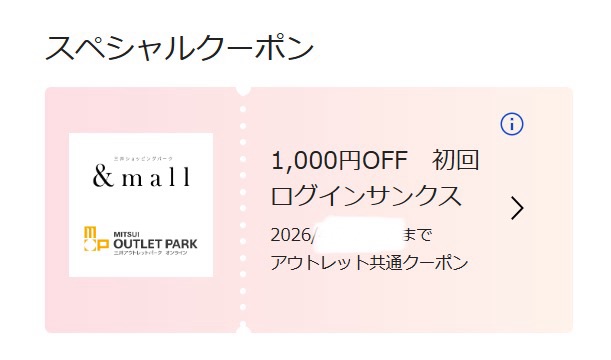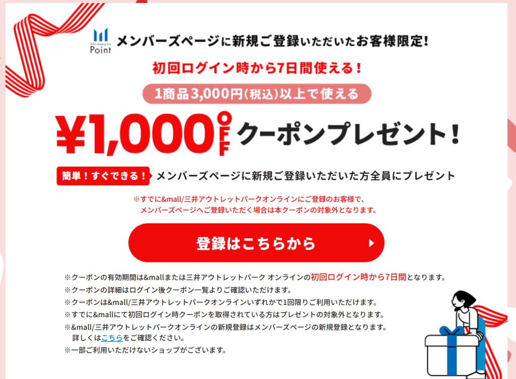 初めて、三井不動産の優待を貰って、新規で登録した方に是非、もらって・利用していただきたいのがこちらの『三井ショッピングパークポイント メンバーズページに新規ご登録いただいたお客様限定!初回ログイン時から7日間使える!1商品3,000円(税込)以上で使える¥1,000OFFクーポンプレゼント!』です!