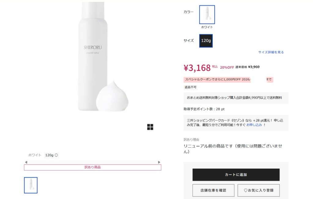 かぶうさは、新規クーポンを使うべく”3,000円(税込)以上の商品” かつ “欲しいもの” を見つけた結果、こちらのSHIRORU(洗顔料)にしました。