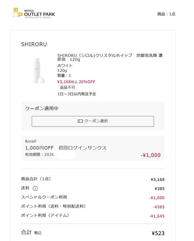 三井アウトレットパークオンラインでは、送料が385円ほどかかり、現金523円のみの持ち出しで洗顔料をいただくことができました。