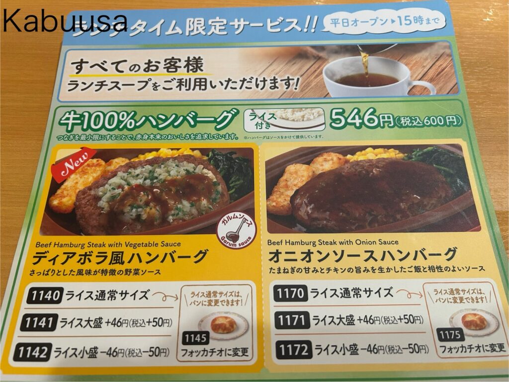 ちなみに、グランドメニューにあるディアボラ風ハンバーグは、税込500円!(付け合わせは少々違うかもしれませんが…)この時点で、もうライスの通常サイズ価格137円分がお得!