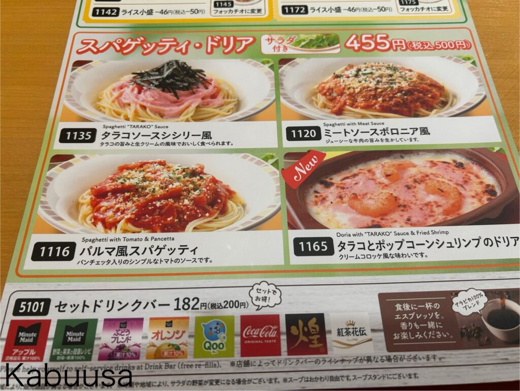 ワンコイン税込500円で食べられるメニューがこちら(下記)の”スパゲッティ3種とドリア”です。