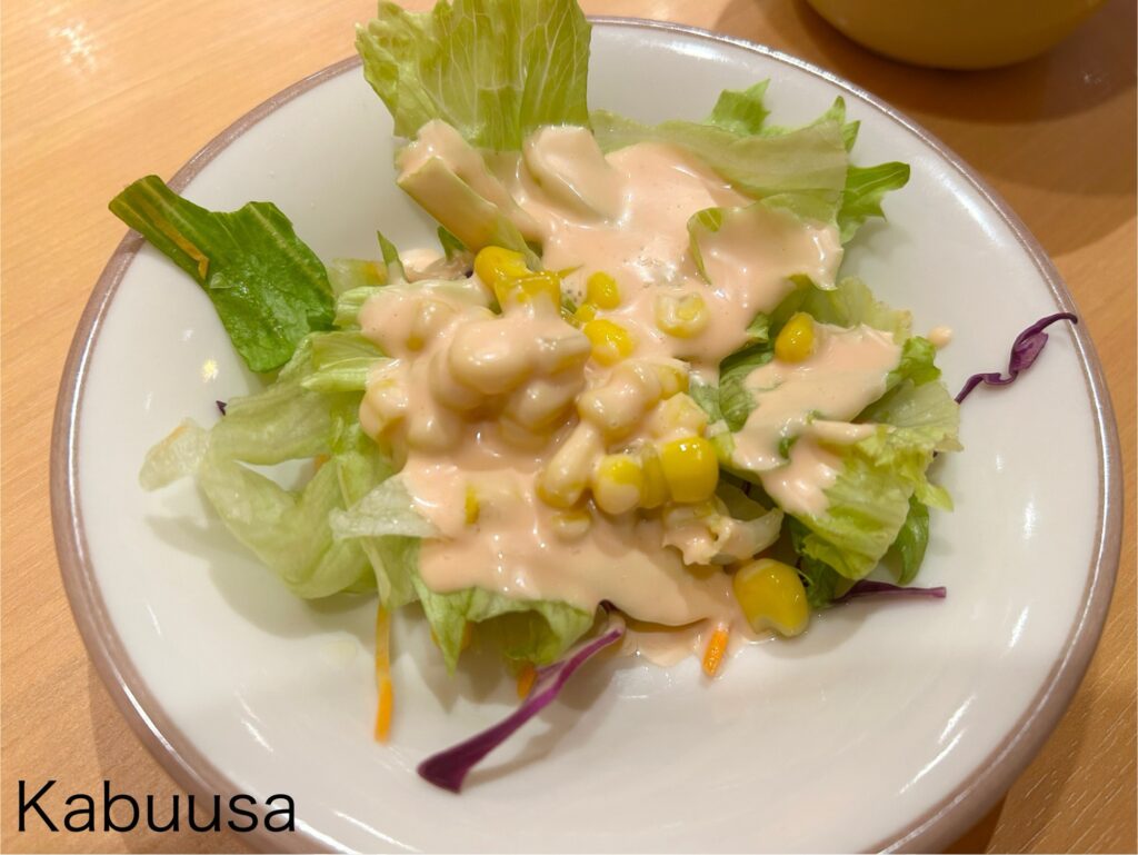レタスと細切りの人参、赤キャベツ、コーンがたっぷりで充分の量。