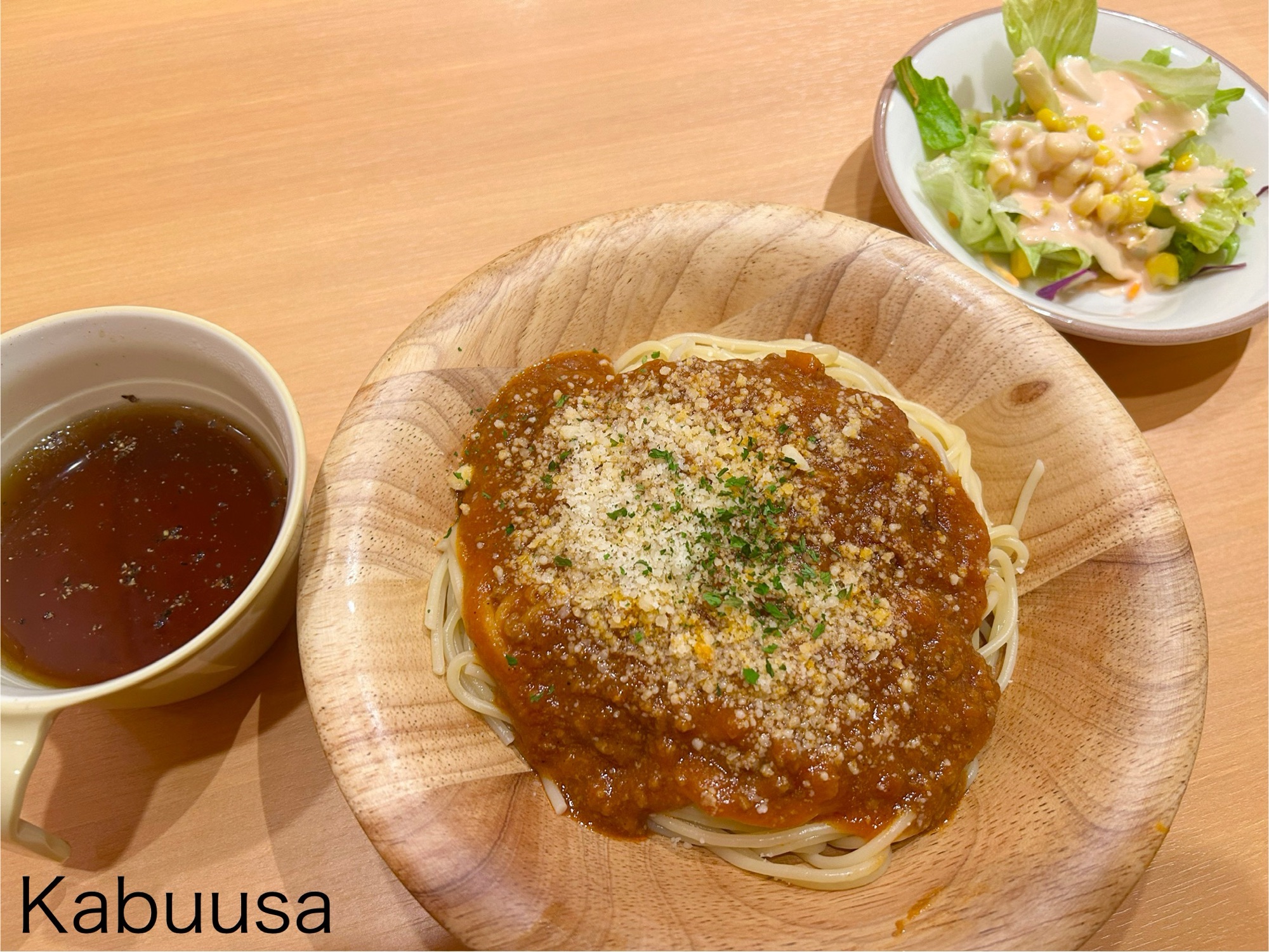 サラダ、スープ、スパゲッティのセットで、税込500円はお得すぎます!
