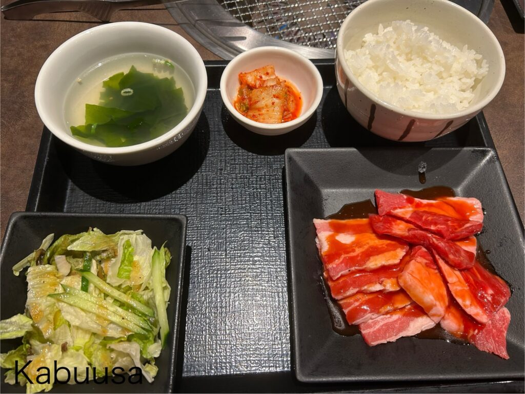 お肉に加えてサラダ、白菜キムチ、ごはん、わかめスープも付いてきますよ♪