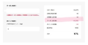 商品2点(バックとタイツ)と送料550円で合計金額3,625円が株主優待のオンラインクーポン3,000円分と送料分550円、そして溜まっていた4ポイントを使い、今回のお支払い金額は71円でした。