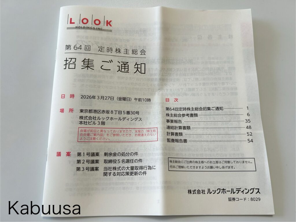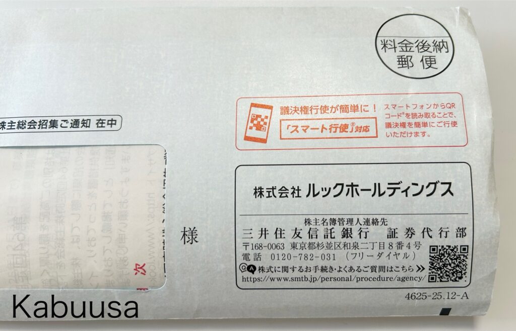 3月中旬頃、株式会社ルックホールディングスから「定時株主総会」&「QUOカードが貰える議決権ご行使のお願い」が到着したので、ご紹介します。