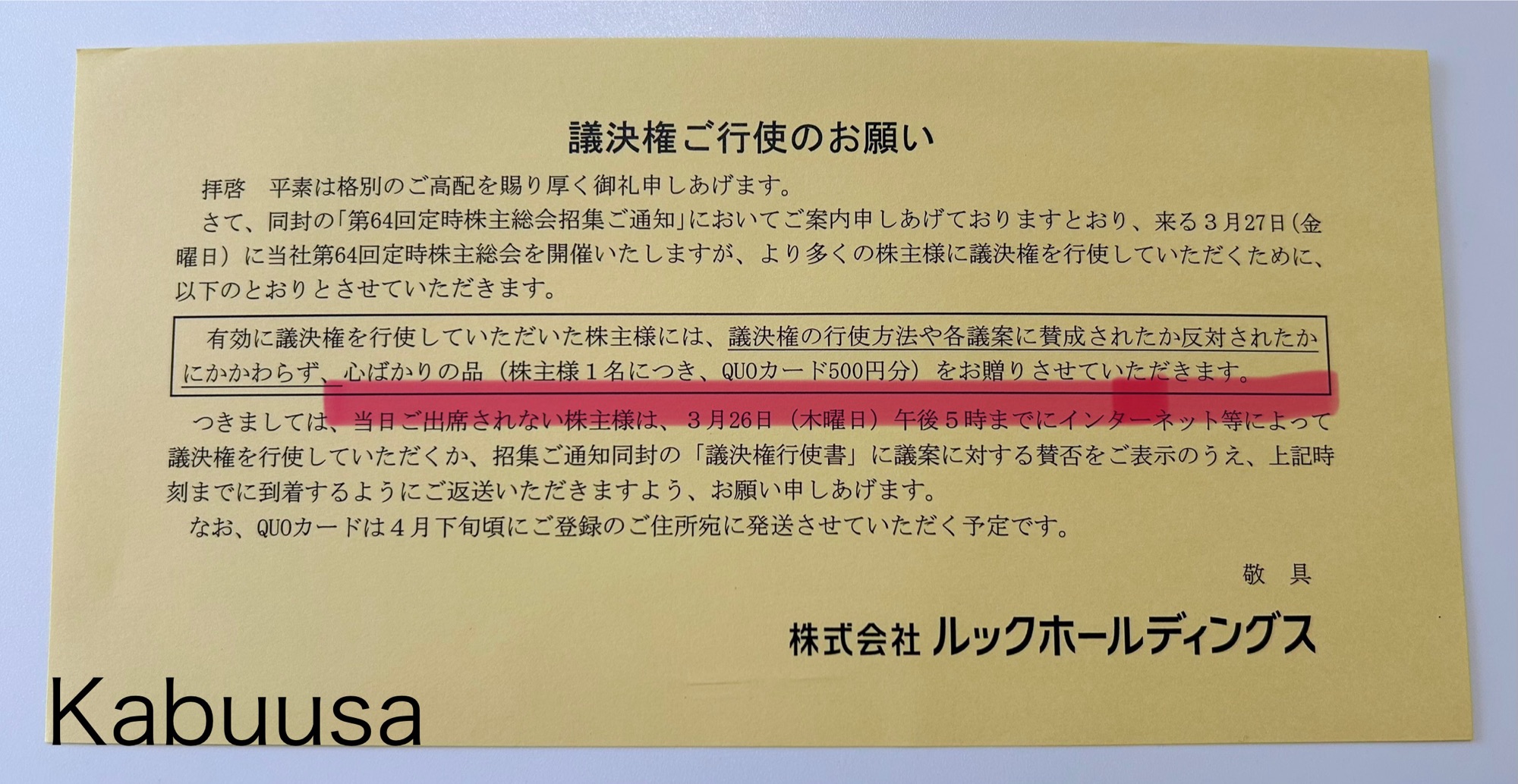 3月中旬頃、株式会社ルックホールディングスから「定時株主総会」&「QUOカードが貰える議決権ご行使のお願い」が到着したので、ご紹介します。