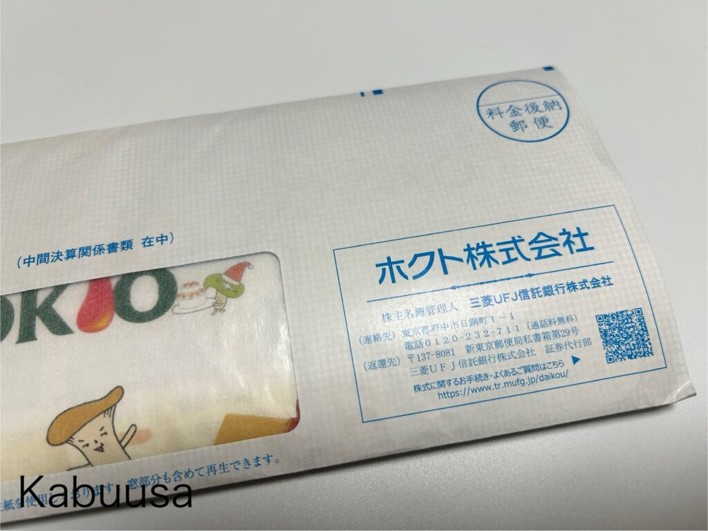 12月の上旬頃、ホクト株式会社から1株の保有でも貰える隠れ優待と中間配当が届いたのでご紹介します。