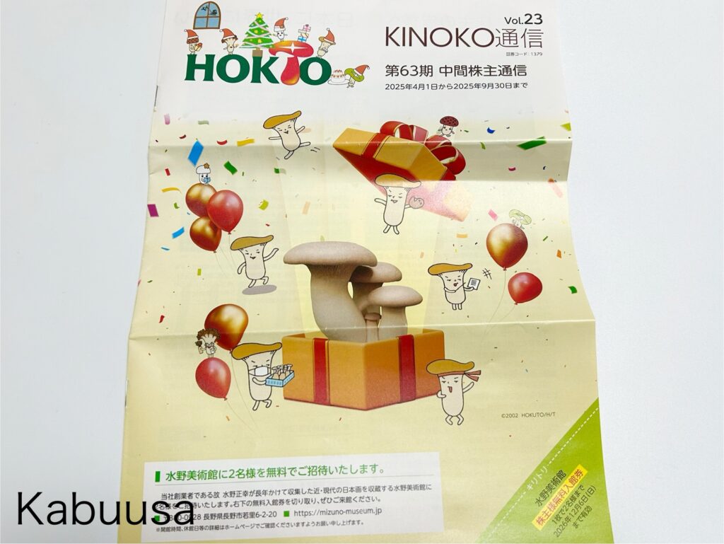 ホクト株式会社の1株の保有でも貰える株主優待は、「HOKUTO KINOKO通信vol.23 第63期 中間株主通信 2025年4月1日から2025年9月30日まで」の表紙の右下に付いていました。