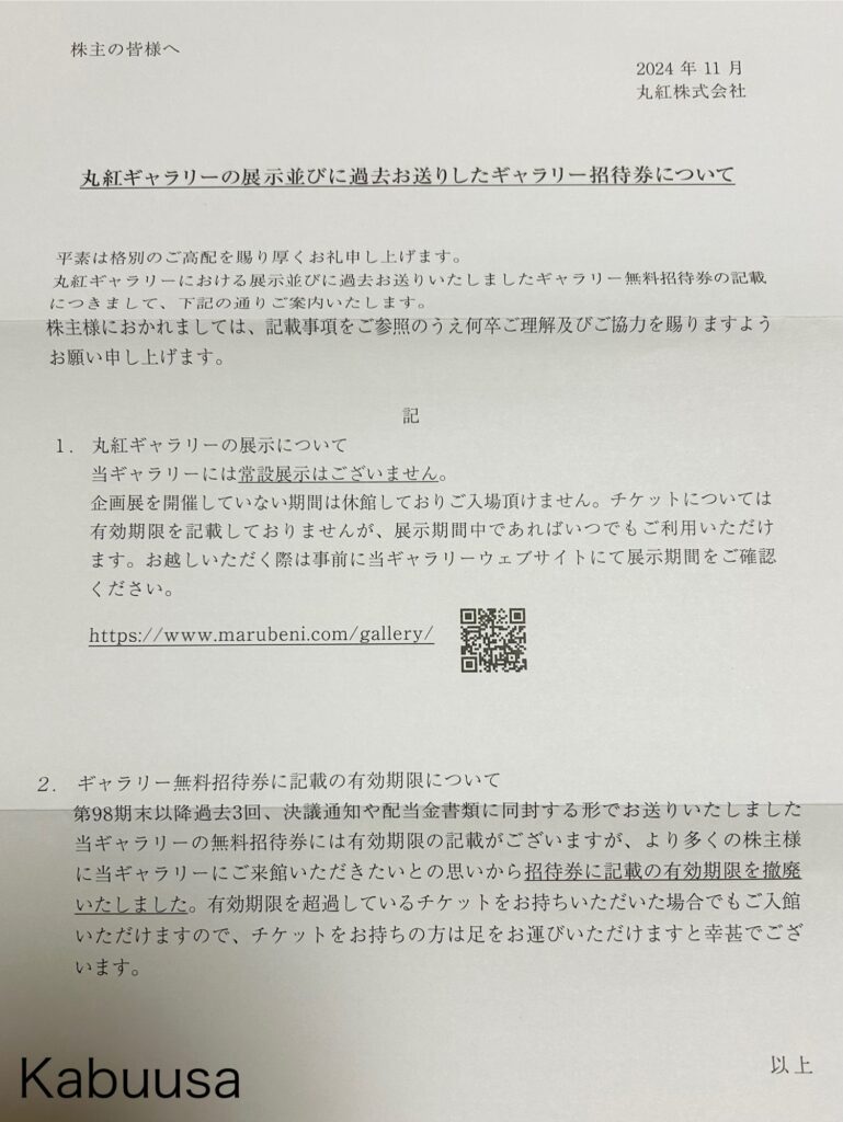 丸紅株式会社の隠れ優待「丸紅ギャラリー無料招待券」にあった有効期限が撤廃されました。