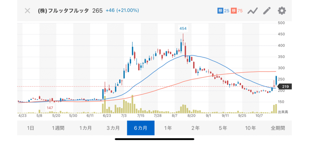 フルッタフルッタ(2586)の株価は、2025年10月20日現在 265円で、100株以上を保有する株主に年2回(3月・9月)、自社ECサイトにて、通常販売価格から株主様限定の割引率を適用した優待価格で商品を購入できるというものです。