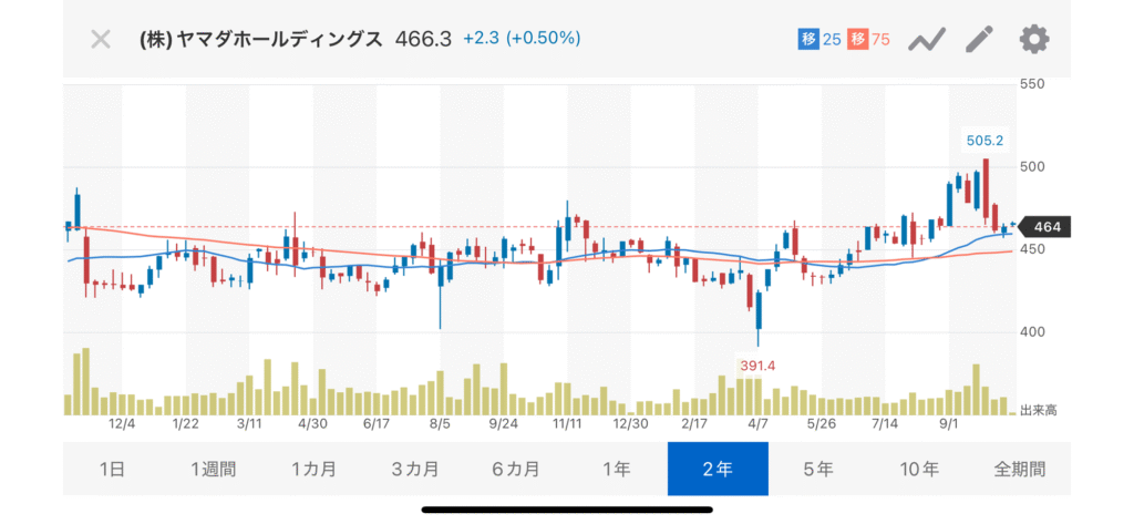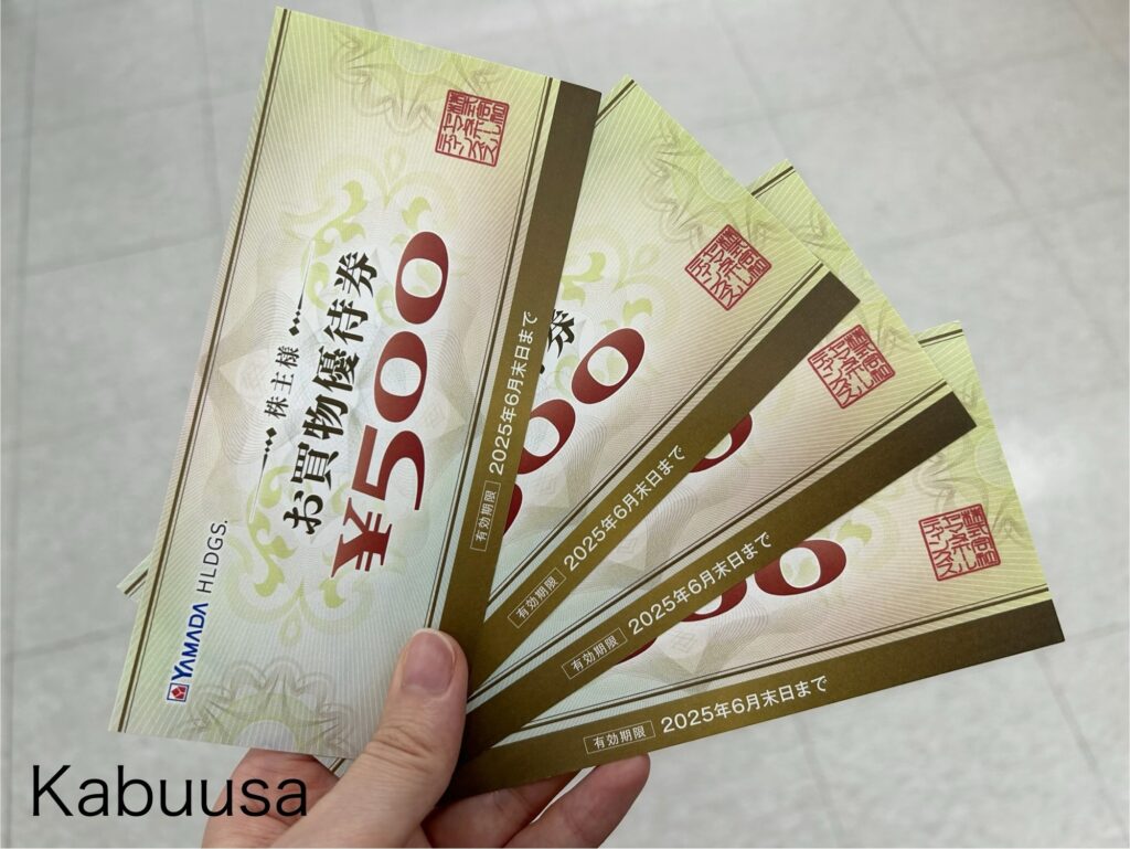 ヤマダホールディングス(9831)の株価は、2025年10月20日現在 466.3円で、100株以上を保有する株主に年2回(3月・9月)、1回のお買い上げ金額が税込み合計金額1,000円以上につき1,000円ごとに1枚利用できる(500円割引される)株主様お買物優待券がいただけます。